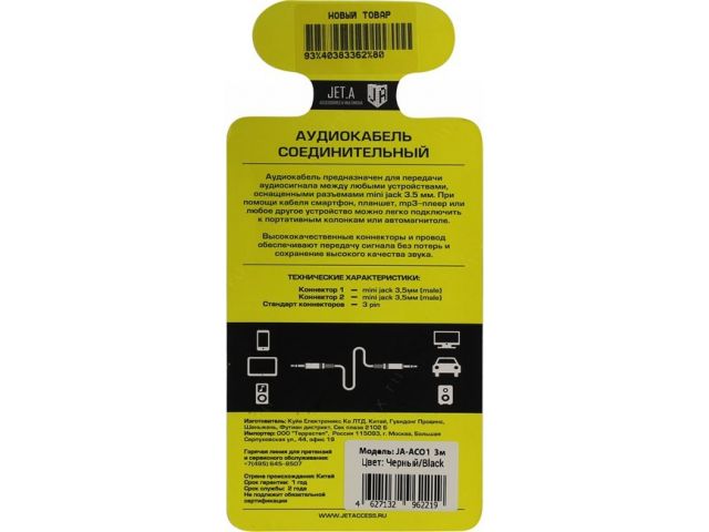 JETACCESS JA-AC01 3м Black Кабель Jack3.5-M -- Jack3.5-M 3м
