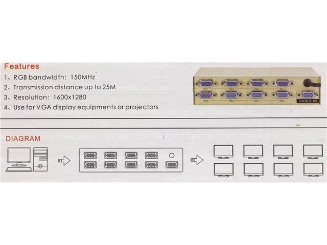 8-Port Video Splitter (VGA15F+8xVGA15F) + б.п.