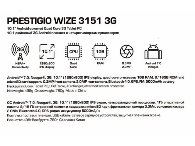 Prestigio WIZE 3151 3G  PMT3151_3G_D_CIS Black 1.3GHz/1/8Gb/3G/WiFi/BT/Andr7.0/10.1 /0.5 кг