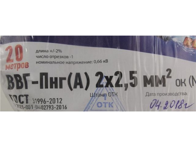 Кабель силовой плоский, ВВГ-Пнг(А) 2х2.5мм2 бухта 20м  Rexant  01-8202-20