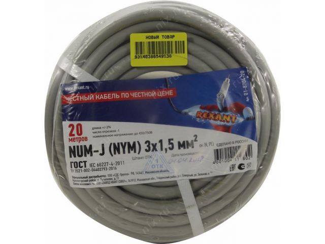 Кабель силовой, NUM-J (NYM) 3x1.5мм2 бухта 20м Rexant 01-8704-20