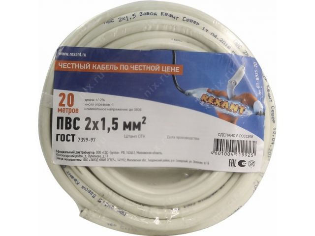 Кабель силовой, ПВС 2х1.5мм2 бухта 20м  Rexant  01-8035-20