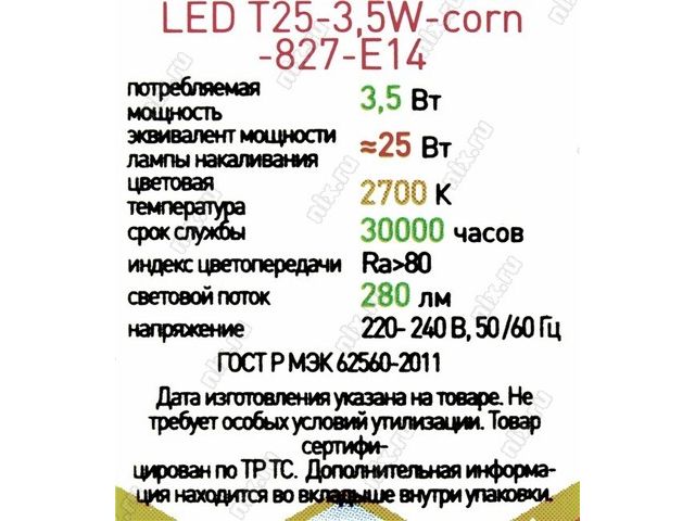 ЭРА T25-3.5W-CORN-827-E14 (E14, 280 люмен, 2700К, 3.5Вт,220-240В)