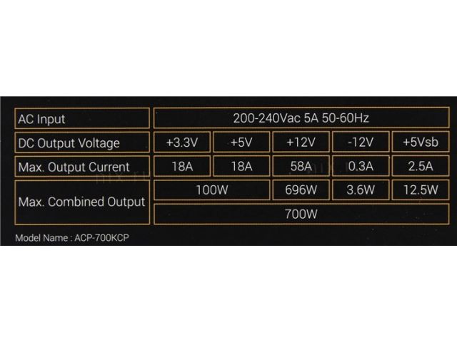 Максимальная нагрузка+3.3V - 18A, +5V - 18A, +12V - 58A, +5VSB - 2.5A, -12V - 0.3A; Комбинированная нагрузка: +3.3V&+5V - 100 Вт