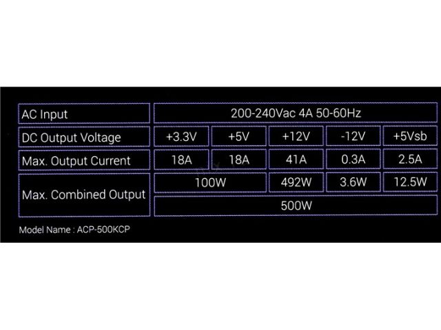 | Максимальная нагрузка | +3.3V - 18A, +5V - 18A, +12V - 41A, +5VSB - 2.5A, -12V - 0.3A; Комбинированная нагрузка: +3.3V&+5V - 100 Вт |