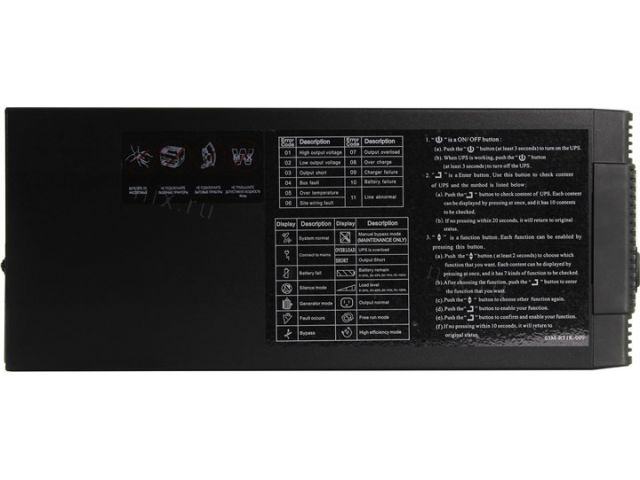 | ЖК-дисплей | Есть. Отображает: Входное / выходное напряжение, частота входного / выходного напряжения; Режимы работы: нормальный, байпас, питание от батарей; уровень заряда батарей; уровень нагрузки |