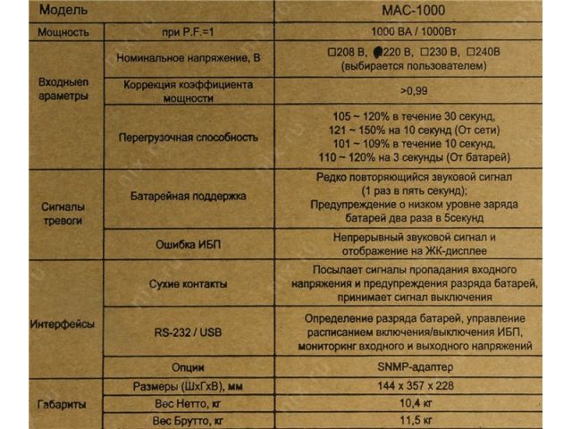 | Максимальная выходная мощность | 1000 ВА |