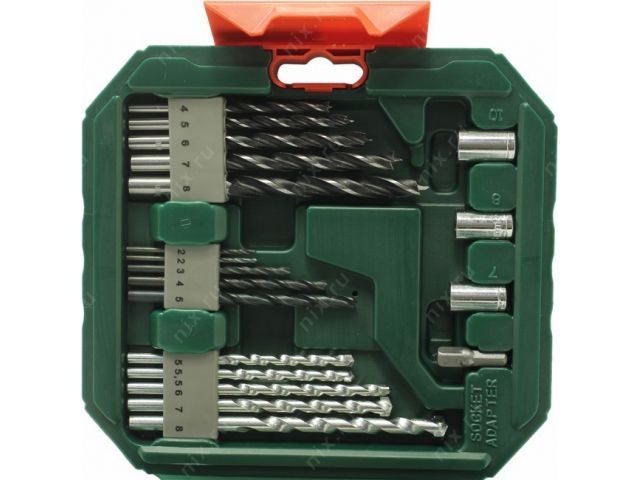 Комплект поставки5 сверл по металлу HSS, 2-5 мм5 сверл по камню, 5-8 мм5 сверл по древесине, 4-8 мм13 насадок-бит, L = 25 мм PH 1/2/3 PZ 1/2/3 S 4/6/7 T 15/20/25/303 торцовых ключа, 7/8/10 мм1 переходник для торцовых ключей1 универс. держатель, магнитный1 зенкер