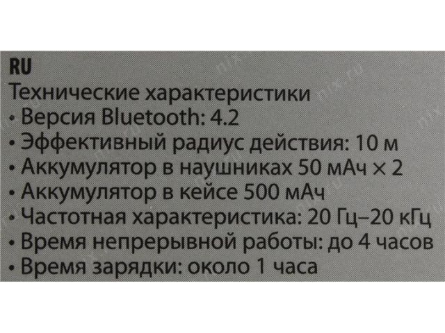 Емкость аккумулятора50 мАч - емкость аккумулятора каждого из наушников;500 мАч - емкость встроенного в футляр аккумулятора