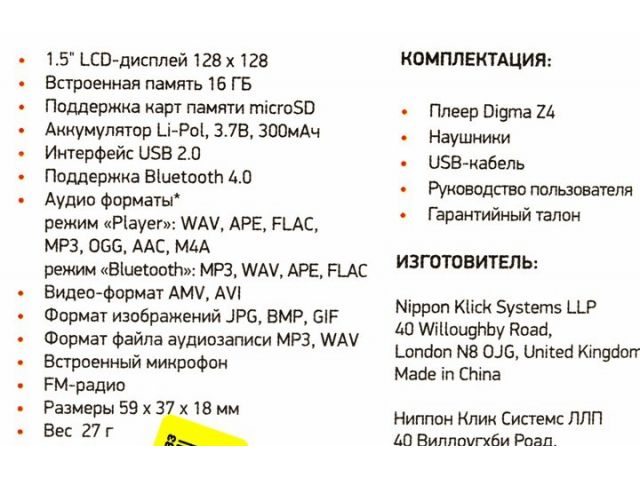 Digma Z4-16Gb-Black (MP3 Player,FM Tuner,16Gb,MicroSD,LCD 1.5 ,диктофон,USB,BT,Li-Pol)