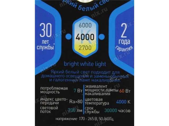 | Эквивалент лампы накаливания | 60 Вт |