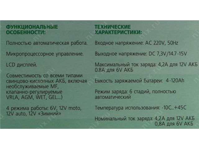 Полностью автоматическое зарядное устройство, предназначенное для зарядки автомобильных и мотоциклетных аккумуляторов 12 или 6 Вольт ёмкостью от 4 до 120 Ач. Есть режим зарядки при низкой температуре. Удобный дисплей для выбора режимов и вывода информации о зарядке. Подходит для свинцовых аккумуляторов типа Pb, MF, GEL,AGM, VRLA. Зарядка проходит в 6 стадий