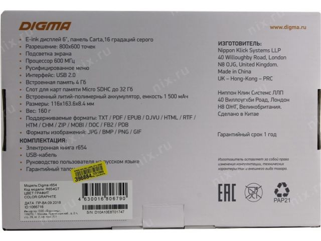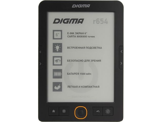 Digma R654 (6 , mono,подсветка, 1024x758,4Gb,FB2/PDF/DJVU/RTF/CHM/EPUB/DOC/JPG/BMP, microSDHC, USB2.0)