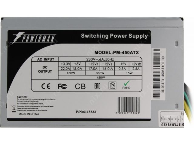Блок питания Powerman PM-450ATX 450W ATX (24+2x4+6пин)  6115832
