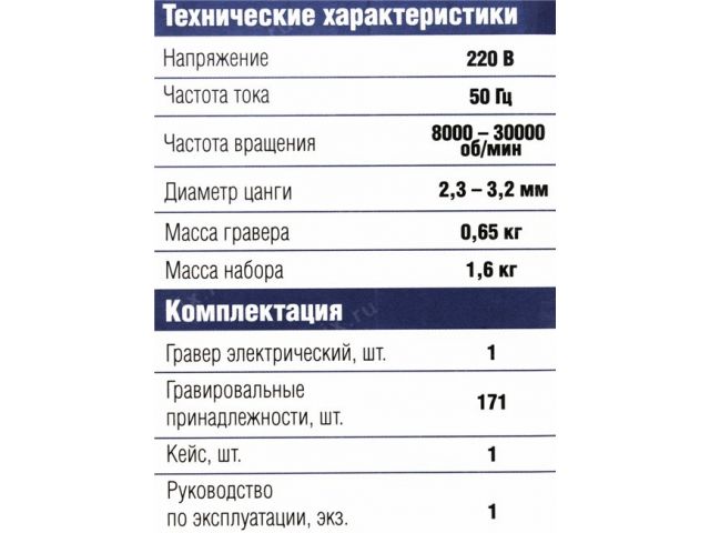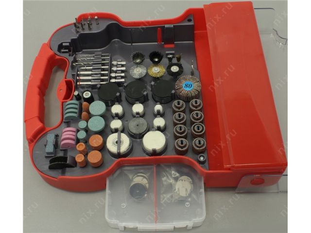 | Комплект поставки | Коробка для оснастки, Набор шлифовальной и отрезной оснастки, Чемодан. Оснастка включает в себя: цанги, круги шлифовальные, войлочный полировальный круг, фетровый полировальный круг, державка для фетровых кругов, резиновый полировальный круг, сверла по металлу, державки для шлифовальных цилиндров,