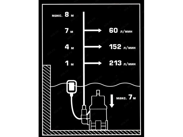 | Безопасность | Автоматическое включение и выключение (поплавковый выключатель), термопредохранитель для защиты двигателя. |