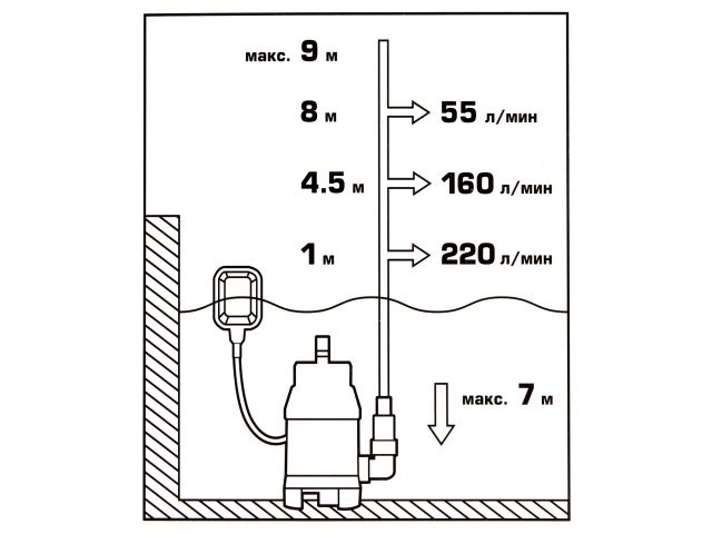 | Безопасность | Автоматическое включение и выключение (поплавковый выключатель), термопредохранитель для защиты двигателя. |