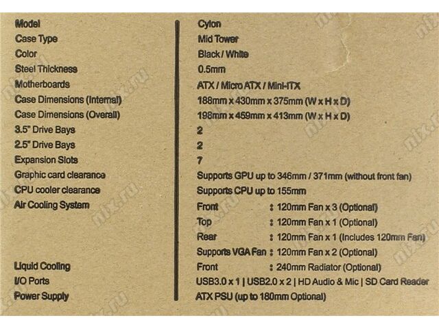 | Место для вентилятора на нижней панели | 2 вентилятора: 120 x 120 мм |