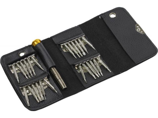Набор инструментов для точных работ ремонта смартфонов или планшетов. В комплекте отвертка с надежным цанговым зажимом, отсеком для хранения стержней внутри рукоятки и набором бит под шлицы Phillips, TORX, Pentalobe 0.8 (отвертка для iPhone), Tri-wing 0.6 (отвертка для iPhone 7), Tri-angle длиной 40 мм. Всего 24 биты. Отличный инструмент для ремонта iPhone / iPad и другой техники Apple, где применяются винты с шлицем в виде пятиконечной звезды (Pentalobe и Tri-wing)