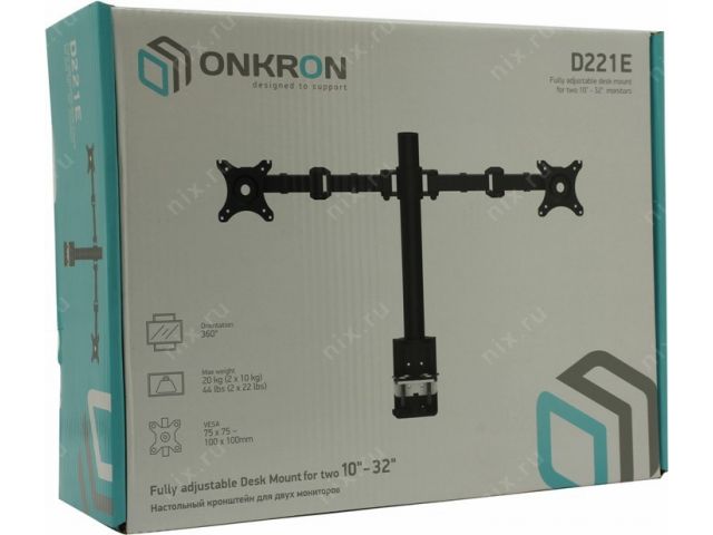 ONKRON D221E Настольный кронштейн для 2-х мониторов (VESA75/100, 10-32 , 2x10кг)