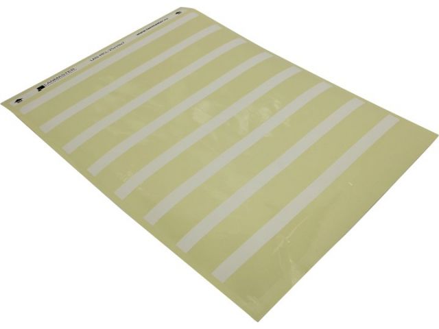 Полоски 25x10 мм, состоящие из белого поля 7x10 мм для маркирующей надписи и прозрачной клейкой пленки 18x10 мм. Маркировка на белое поле наносится лазерным принтером, фломастером, ручкой или карандашом. Прозрачная клейкая пленка оборачивается вокруг маркируемого кабеля и надписи с маркировкой. Прозрачная клейкая пленка клеится сама к себе.