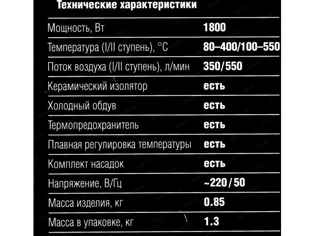| Температура воздуха | 80 - 400°C / 100 - 550°C (первая/вторая ступень) |