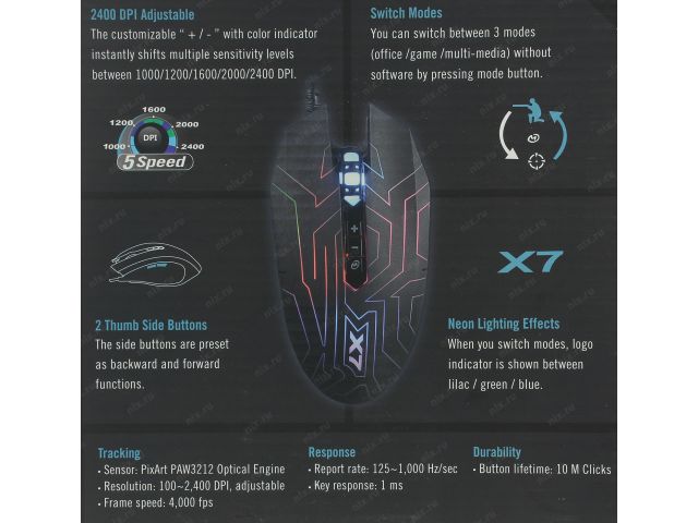 Разрешение сенсора мыши2400 dpi, 2000 dpi, 1600 dpi, 1200 dpi, 1000 dpi