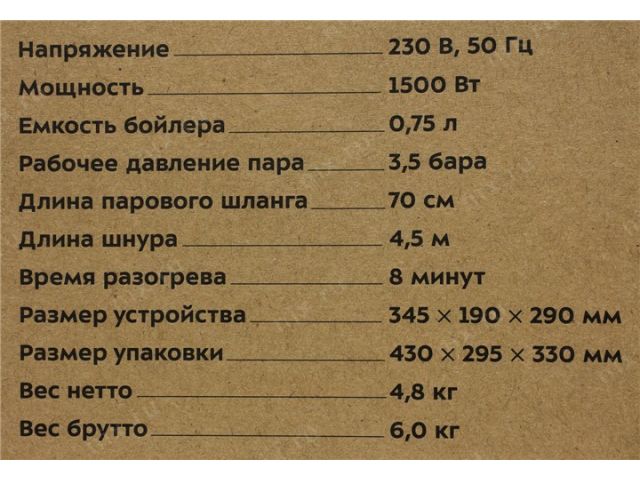 | Комплект поставки | Большая круглая нейлоновая щетка, Воронка, Ворсовая щетка, Маленькая круглая латунная щетка, Маленькая круглая нейлоновая щетка, Мерный стаканчик, Насадка для отпаривания, Скребок, Струйная насадка, Съемный паровой шланг, Тряпка для отпаривания, Тряпка для пола, Угловая насадка, Удлинительные трубки, Щетка для пола |