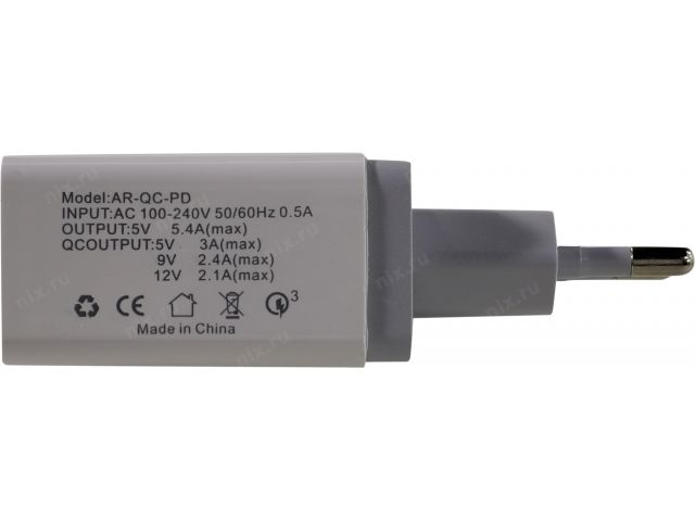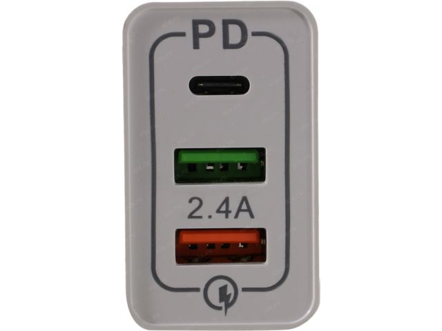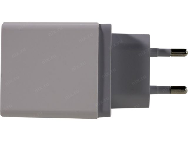 Зарядное устройство с двумя USB портами и разъемом USB Type C. Выходы поддерживают функции быстрой зарядки Qualcomm Quick Charge 3.0 и USB Power Delivery 2.0 для мобильных устройств (до 18 Вт на порт, но суммарная максимальная мощность БП не превышает 27 Вт).