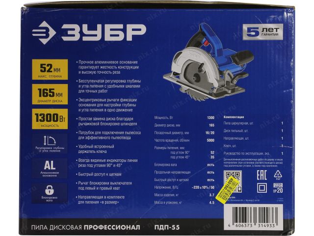 Пила дисковая 1300 Вт ЗУБР ПДП-55