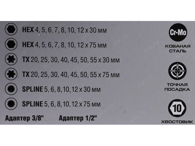 Комплект поставки38 бит с посадочным местом 10 мм: L30мм TORX: T20/25/30/40/45/50/55 L30мм HEX: HEX4/5/6/7/8/10/12 L30мм SPLIN: 5/6/8/10/12 L75мм TORX: T20/25/30/40/45/50/55 L75мм HEX: HEX4/5/6/7/8/10/12 L75мм SPLIN: 5/6/8/10/12 Переходник 10 мм на 3/8 Переходник 10 мм на 1/2