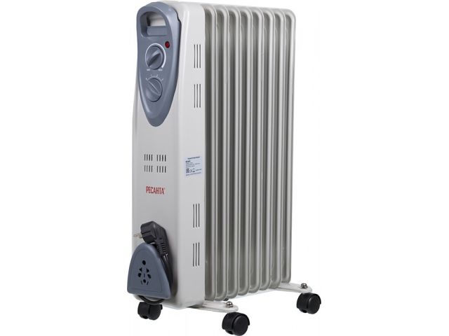 | Масляный радиатор РЕСАНТА ОМ-9Н предназначен для обогрева воздуха и создания комфортной атмосферы в холодное время года. Особенности радиатора: Три режима обогрева, которые переключаются удобной ручкой. Термостат, который регулируется специальной ручкой и позволяет прибору автоматически поддерживать необходимую температуру. Световой индикатор для контроля рабочего состояния масляного радиатора. Для удобства перемещения конструкция прибора оснащена колесами Преимущества: Режим поддержания температуры; Современный дизайн; Три режима обогрева; Механическое управление; Малые габариты, небольшой вес. Комплектация: Масляный радиатор - 1 шт. Колесики - 4 шт. Проволочные петли и гайки для крепежа Руководство по эксплуатации - 1 шт. Всё о масляных радиаторах Как устроен масляный радиатор? Масляный нагреватель представляет собой герметично закрытую металлическую ёмкость, своей формой напоминающую радиатор центрального отопления, заполненную минеральным маслом. Внутри ёмкости размещаются нагревательные ТЭНы, расположенные в нижней части корпуса и полностью погруженные в масло. ТЭНы разогреваются и передают свою тепловую энергию маслу, которое, в свою очередь, нагревает ребристый корпус масляного радиатора. Поскольку поверхность корпуса масляного нагревателя имеет сравнительно невысокую (не превышает 60 С) температуру, нагреватели такого класса практически не сушат воздух и не сжигают находящуюся в нем пыль. Особенности конструкции масляного нагревателя Практически все современные радиаторы оснащены термостатом, плавным регулятором температуры, системой защиты от перегрева, световой индикацией, а также двух- или трех-позиционным переключателем режима работы. Такой переключатель позволяет выбрать одну из нескольких степеней мощности, каждой из которых соответствует свой ТЭН. Это позволяет добиваться оптимальной температуры в помещении и заодно экономить электроэнергию. Как подобрать мощность масляного радиатора? При выборе масляного радиатора нужно знать следующее правило: на обогрев каждых 10 м2 комнаты с высотой потолка 3 метра, необходим 1 кВт энергии нагревателя. Кроме того, если в помещении, где установлен масляный радиатор, имеются два окна или одна из стен внешняя, то расход тепла увеличивается ещё на 0.2кВт на 1 м2. Учитывая тот факт, что мощность масляного радиатора ограничивается 3 кВт, можно сделать вывод, что максимальная площадь обогреваемого помещения для масляных нагревателей ограничивается 25-30 м2. Сегодня существует огромное количество всевозможных масляных радиаторов, которые отличаются друг от друга не только мощностью, но и всевозможными дополнительными приспособлениями. Вентилятор, дополнительная крышка для сушки белья, эффект камина. Все это существенно повышает цену на масляный радиатор, но так ли они нужны? Ведь основная функция радиатора - простой обогрев воздуха в помещении. Термостат сейчас имеется почти в каждом масляном радиаторе. Без сомнения, он существенно облегчает его эксплуатацию. Радиатору задаётся оптимальный для данного помещения температурный режим, и он включается и выключается в соответствии с температурой окружающего воздуха. Это очень удобно. С помощью термостата масляный радиатор поддерживает стабильную температуру в квартире и тем самым экономит электроэнергию. 