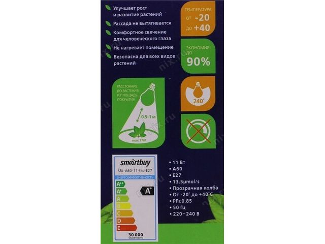 Smartbuy SBL-A60-11-fito-E27 (E27, 11Вт, 13.5µmol/s, 220-240В) фитолампа для растений