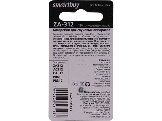 • Smartbuy SBZA-A312-6B (Zinc-Air, 1.45V)  уп. 6 шт