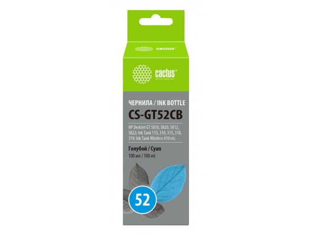 Чернила Cactus CS-GT52CB Cyan для HP DJ GT5810/12/20/22, Ink Tank 115/310/315/318/319/410 (100мл)