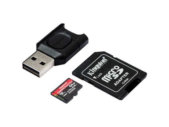 • Kingston MLPMR2/64GB microSDXC Memory Card 64Gb V90 UHS-II U3 + microSD-- SD Adapter+Card Reader