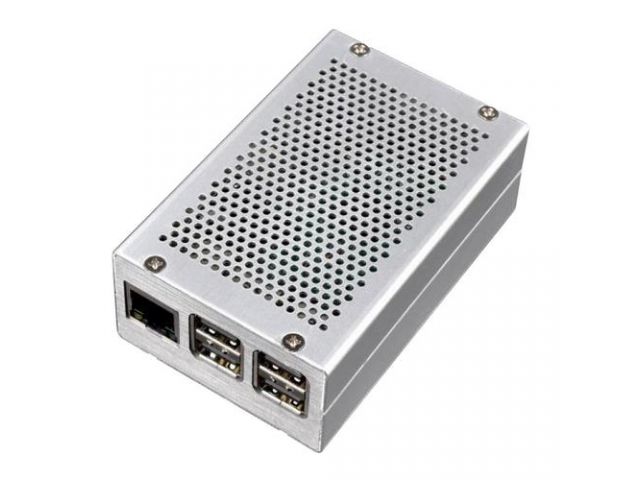 Корпус для компактных ПК Raspberry Pi 3 (также подходит для второго поколения). Имеет отверстия для разъёмов Raspberry Pi, включая отверстие для GPIO. Изготовлен из алюминия, верхняя стенка перфорированная