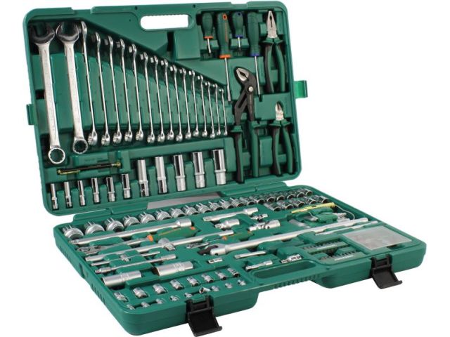 | Набор инструмента в чемодане для автомобиля включает торцевые головки, в том числе свечные головки, под квадрат 1/4 или 1/2 (32 обычных, 11 глубоких и 2 свечные), ключи-трещотки, воротки, удлинители для головок, в том числе гибкий удлинитель, кардан 1/2 , отвертку-вороток (держатель для бит отвёрточного типа), а также набор вставок (биты) под шлицы TORX, PHILLIPS, прямые и шестигранные шлицы разных размеров (37 шт.). В набор также входит комплект комбинированных гаечных ключей (17 шт.), набор отвёрток (4 шт.), пассатижи комбинированные, клещи переставные, магнит, тестер 12-24V и молоток |