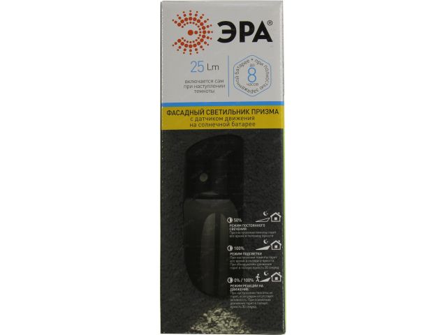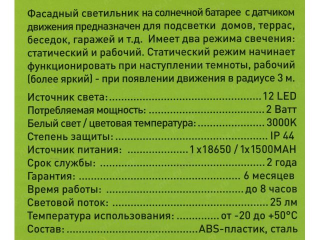 Фасадный светильник с датчиком движения на солнечной батарее. 3 режима работы: свечение всю ночь + яркое свечение при наличии движения, свечение в пол-яркости всю ночь, а также освещение только при наличии движения