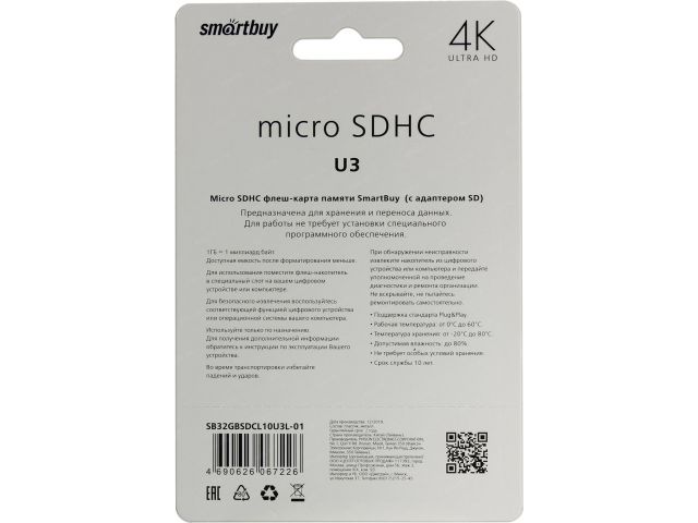 SmartBuy SB32GBSDCL10U3L-01 microSDHC 32Gb UHS-I U3 + microSD-- SD Adapter