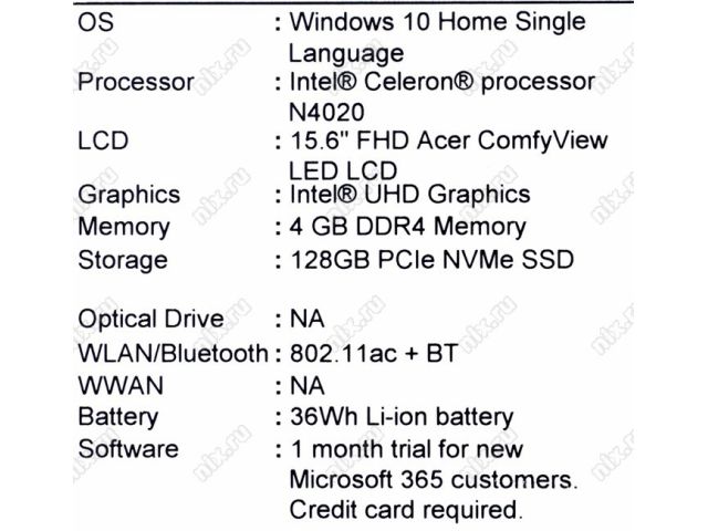 Acer Extensa EX215-31-C1JG  NX.EFTER.00F Cel N4020/4/128SSD/WiFi/BT/Win10/15.6 /1.74 кг