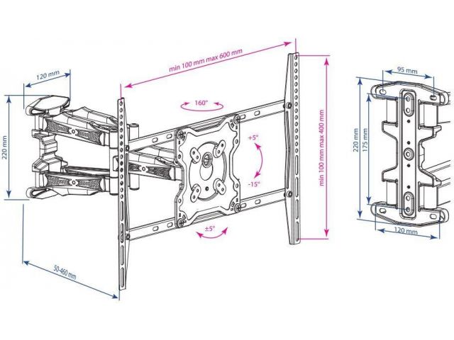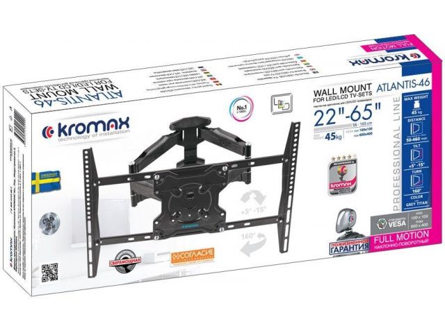 • Kromax ATLANTIS-46 Grey Titan Наклонно-поворотный кронштейн (VESA100-600/400, 22-65 , 45кг)