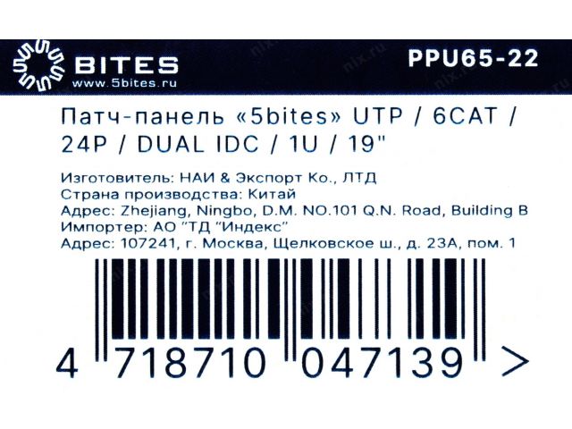 Patch Panel 19 1U UTP 24 port кат.6 5bites PPU65-22 разъём KRONE&110 (dual IDC)