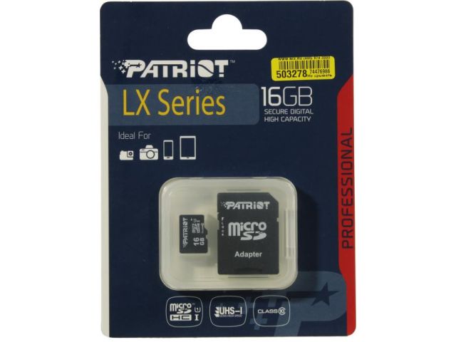 Карта памяти Patriot PSF16GMCSDHC10 microSDHC UHS-I Class 1 (U1), Class 10 16 ГБ +microSD- SD адаптер