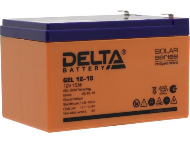 Свинцово-кислотный аккумулятор Delta GEL 12-15 напряжением 12В и емкостью 15Ач изготовлен по технологии AGM+GEL: combined AGM and GEL technology (частичное сгущение электролита). Устойчив к глубоким разрядам. Корпус изготовлен из негорючего ABS пластика. Срок службы аккумулятора достигает 10-12 лет. Аккумулятор предназначен для работы в режиме постоянного подзаряда (буферный режим) или в режиме разряд-заряд (циклический режим). Обладает низким внутренним сопротивлением и саморазрядом.