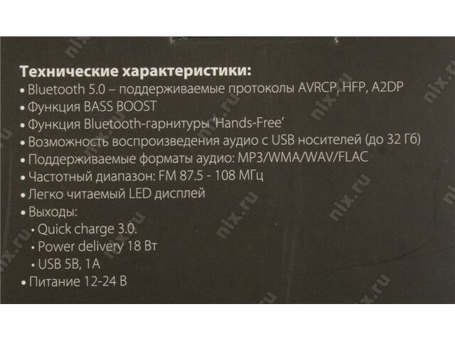 | Многофункциональное устройство, которое сочетает в себе возможности FM-трансмиттера с Bluetooth для подключения плеера, смартфона или планшета + автомобильного MP3-плеера с функцией BASS BOOST для усиления низких частот, способного воспроизводить музыку с USB-порта или карты памяти microSD + автомобильного зарядного устройства USB, включая поддержку бьыстрой зарядки по протаколам QC3.0 и USB PD. Также имеется встроенный микрофон для иcпользования в качестве Bluetooth гарнитуры (hands free) |