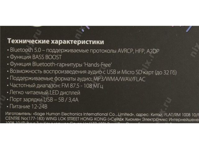 Многофункциональное устройство, которое сочетает в себе возможности FM-трансмиттера с Bluetooth для подключения плеера, смартфона или планшета + автомобильного MP3-плеера с функцией BASS BOOST для усиления низких частот, способного воспроизводить музыку с USB-порта или карты памяти microSD + автомобильного зарядного устройства USB - один из портов выдаёт 5 В и 2.4 А. Также имеется встроенный микрофон для иcпользования в качестве Bluetooth гарнитуры (hands free)