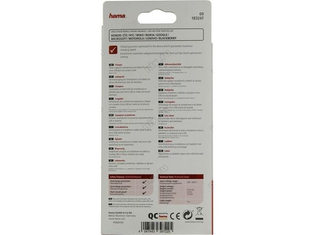 Hama 183247 Зарядное устройство MicroUSB (Вх.AC100-240V, Вых.DC5V, 12W, MicroUSB)