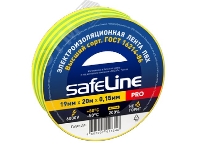 SafeLine 12123 Изолента ПВХ желто-зеленая 19мм 20м Safeline (12123)