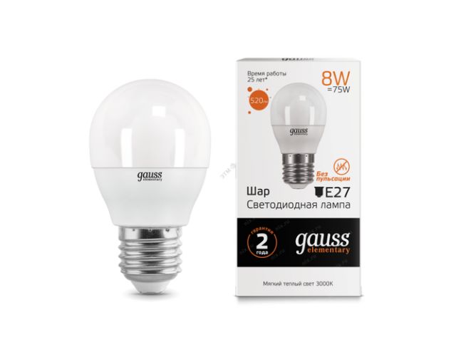 GAUSS 53218 Лампа светодиодная LED 8 Вт 520 Лм 3000К теплая Е27 Шар Elementary Gauss (53218)